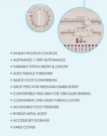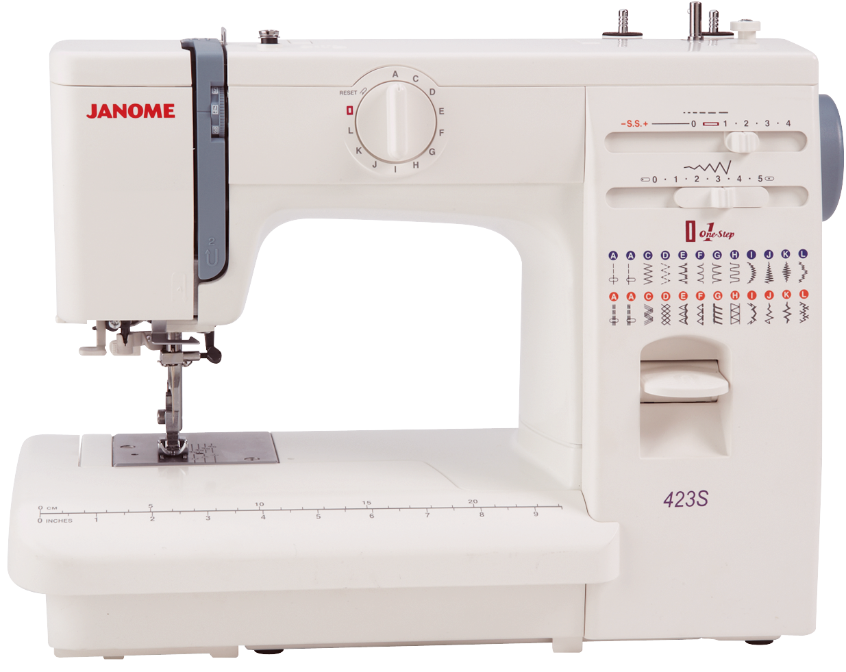 The Janome 423S is a great machine for both beginners and for those with more experience. It is really easy to use with a dial for stitch selection and slide controls for adjusting stitch length and width to suit the fabric being sewn. The automatic 1-step buttonhole is a dream. Just pop a button into the foot and this machine will sew you a perfectly sized buttonhole in one easy step. And the automatic needle threader will make threading a breeze!