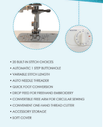 The J3-20 is a great all round sewing machine that is ideal for beginners and more experienced users alike. The machine can be operated with just three dials; one for stitch selection, one for stitch width and the other for stitch length. It couldn’t be simpler!